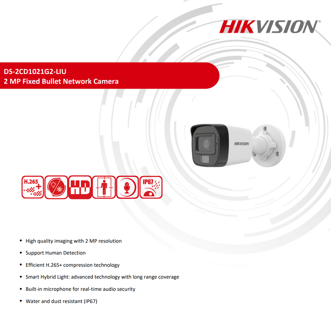 دوربین تحت شبکه Hikvision DS-2CD1021G2-LIU یکی از محصولات کارآمد و اقتصادی هایکویژن است که برای استفاده در فضاهای داخلی و خارجی طراحی شده است. این مدل با طراحی بولت (Bullet) و بدنه فلزی-پلاستیکی مقاوم با استاندارد IP67، در برابر گردوغبار، باران و نوسانات دمایی مقاومت بالایی دارد. قابلیت تغذیه از طریق PoE نیز باعث سهولت نصب و کاهش کابلکشی میشود.