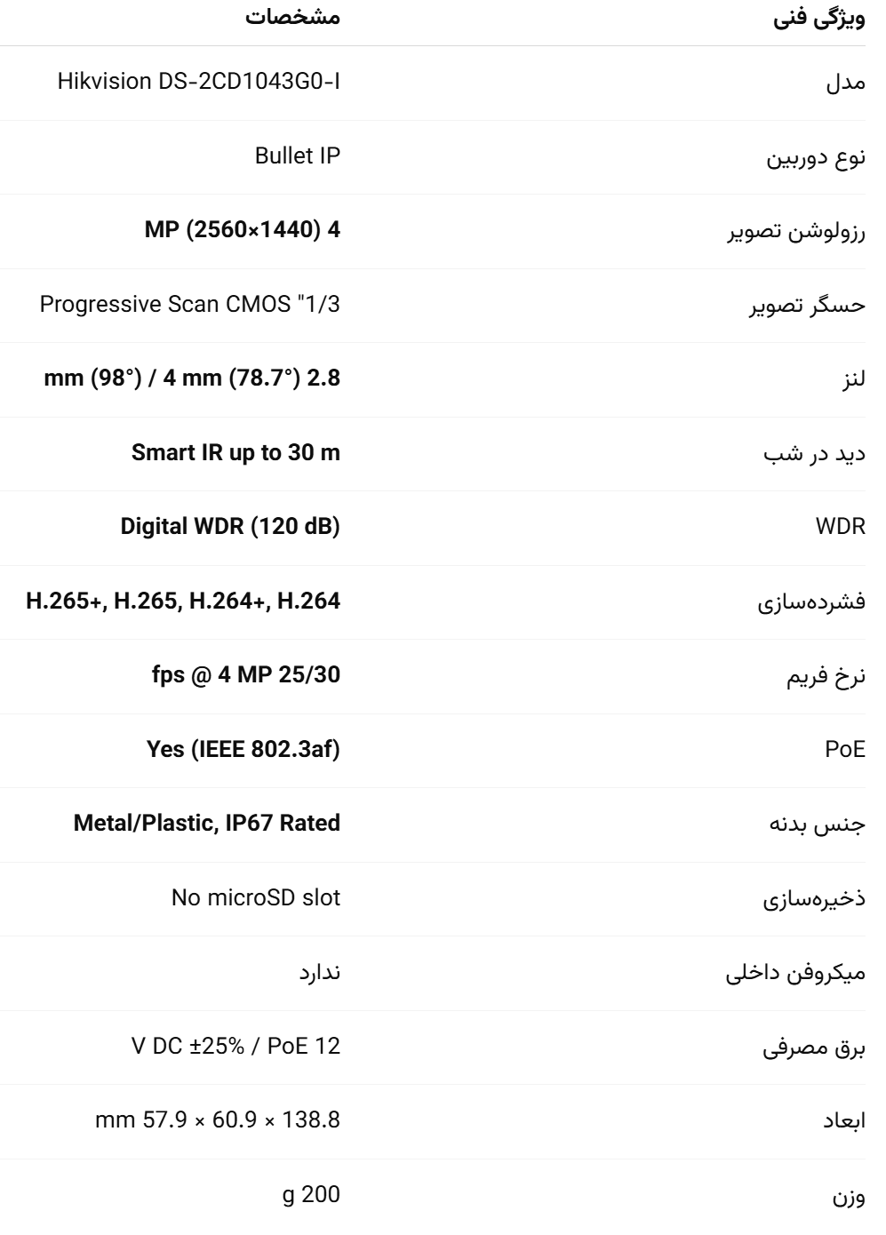 دارای حسگر 1/3" Progressive Scan CMOS و لنز ثابت 2.8 میلیمتر (زاویه دید 98°) یا 4 میلیمتر (زاویه دید 78.7°) است. رزولوشن 4MP جزئیات تصویر را با وضوح بالا نمایش میدهد.