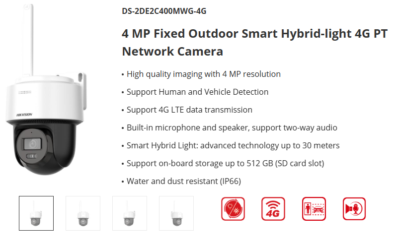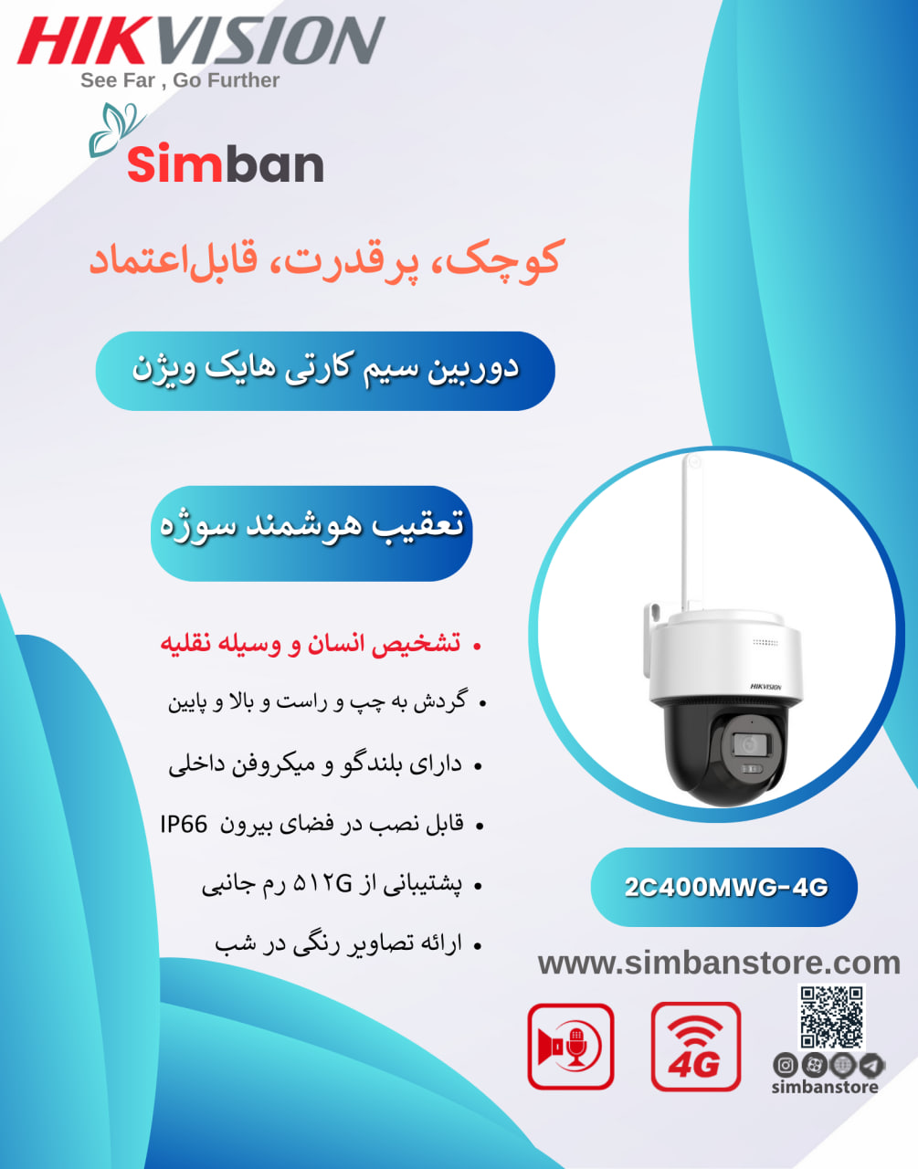 دوربین مداربسته سیمکارتی چرخشی هایک ویژن مدل DS-2DE2C400MWG-4G یک انتخاب ایدهآل برای نظارت هوشمند در محیطهای داخلی و خارجی است. این دوربین با ویژگیهای پیشرفتهای همچون کیفیت تصویر 4 مگاپیکسل، قابلیت چرخش 360 درجه، دید در شب رنگی با فناوری Smart Hybrid Light، و پشتیبانی از شبکه 4G، امکان نظارت از راه دور را بدون نیاز به اینترنت ثابت فراهم میآورد.