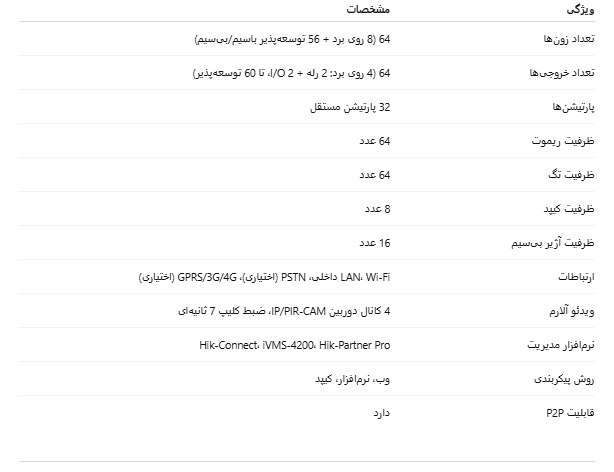 - پشتیبانی جانبیها: تا 64 ریموت، 64 تگ، 8 کیپد و 16 آژیر بیسیم
