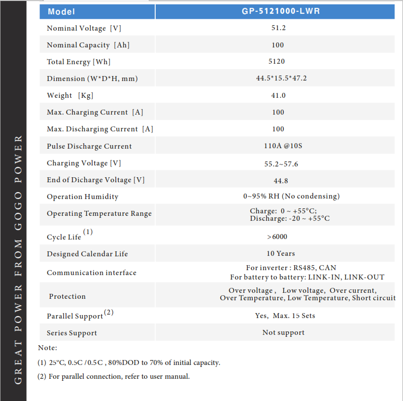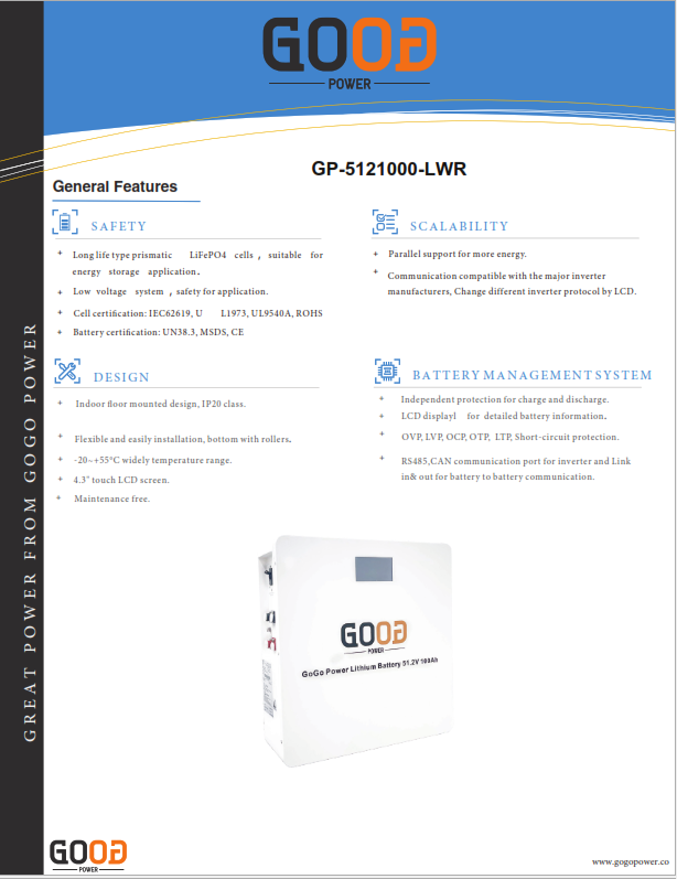 باتری لیتیومی GoGo Power GP-5121000-LWR یه گزینه مطمئن، کمدردسر و آیندهدار برای ذخیره انرژی هست؛ مخصوصاً وقتی دنبال کیفیت بالا و پشتیبانی از اینورترهای مختلف باشی.